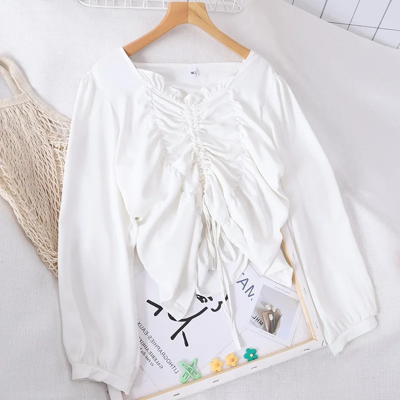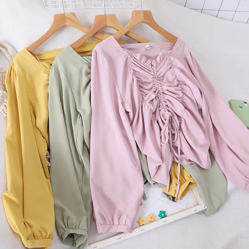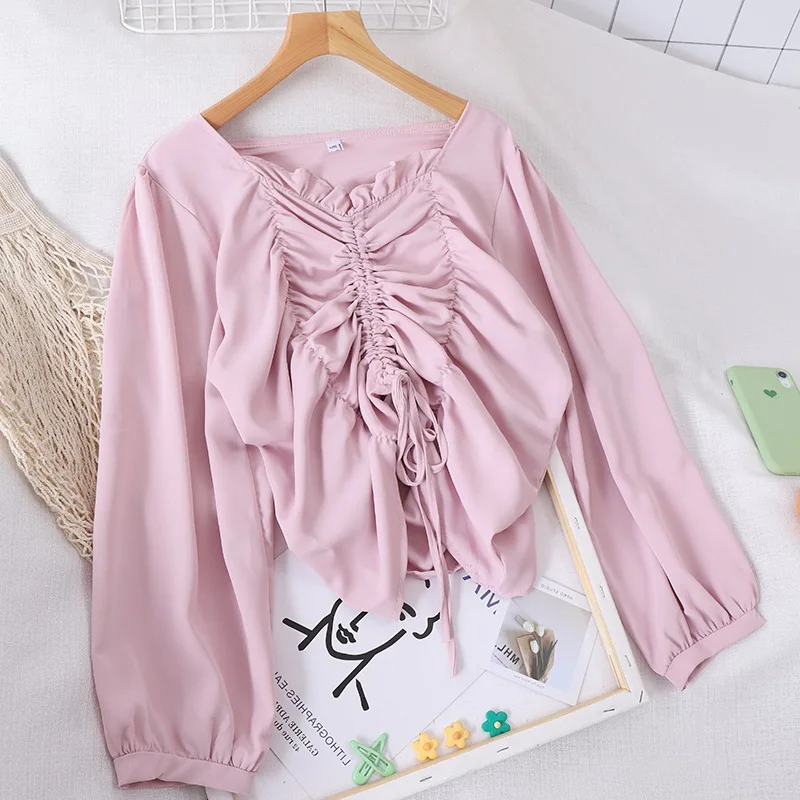 Photo Shoot ~ 0807 Autumn Shirt CHIC Thin Loose-Fit Short Lantern Sleeve Pullover V-neck Long-sleev