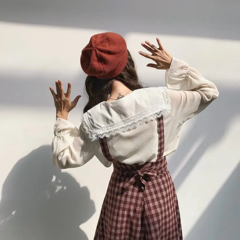 REVIEW TOP SELLER Photo Shoot ~ Japanese-style Hipster Lace Peter Pan Collar Bell Sleeve Shirt + Plaid Suspender Skir