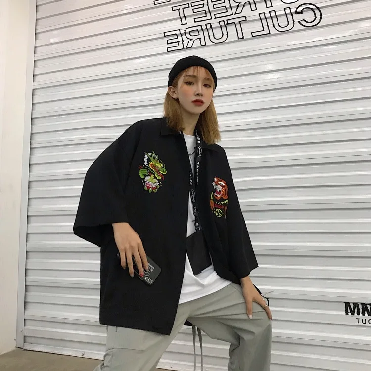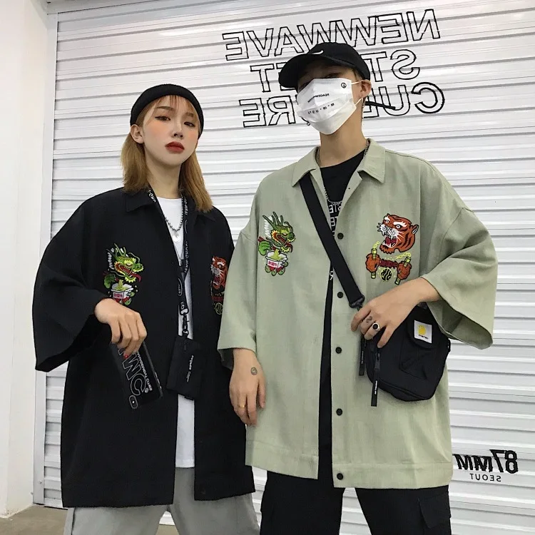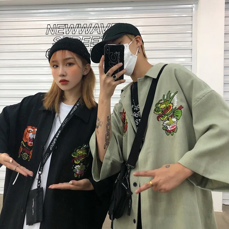 BEST SELLER Photo Shoot Retro China Wind Dragon Tiger Head Embroidered Ulzzang Shirt Men And Women Loose Short