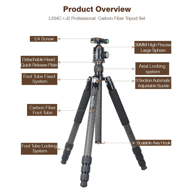 XILETU L334C+J2 Heavy Duty Professional Carbon Fiber Camera Tripod Travel Stand for DSLR Digital Ca