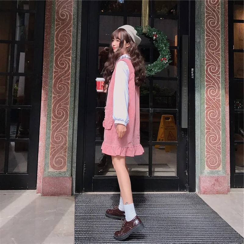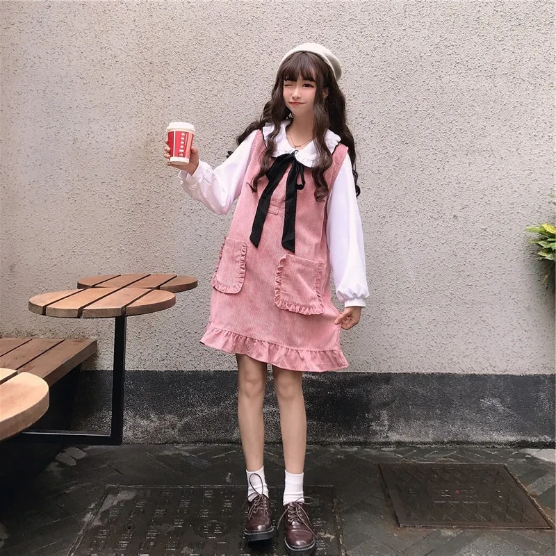 Photo Shoot Early Autumn Sweet Elegant Cute Peter Pan Collar Long-sleeved Shirt Vest Dress Two-Piec