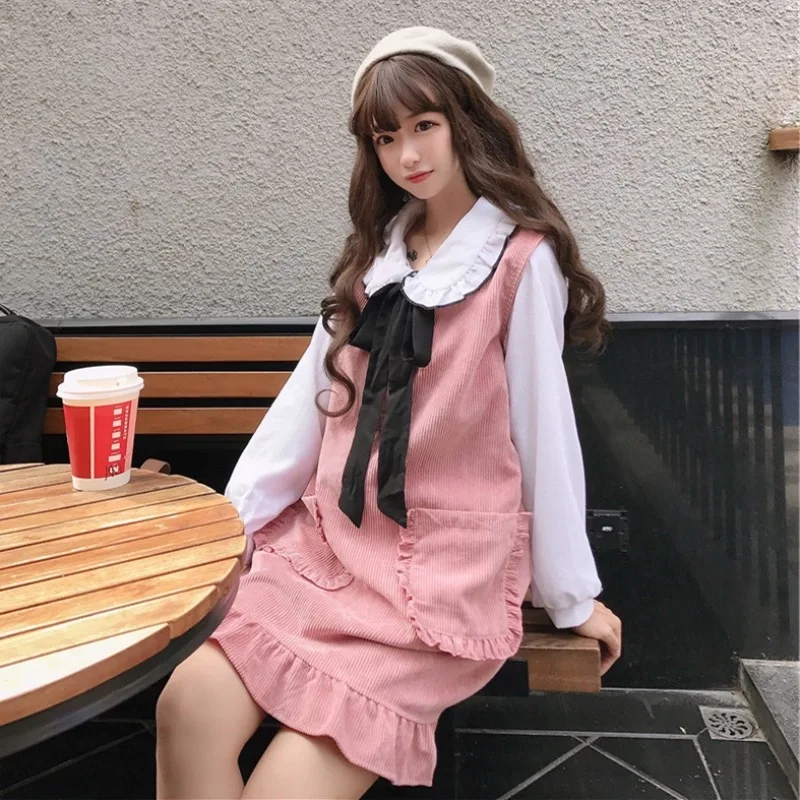 ORIGINAL Photo Shoot Early Autumn Sweet Elegant Cute Peter Pan Collar Long-sleeved Shirt Vest Dress Two-Piec
