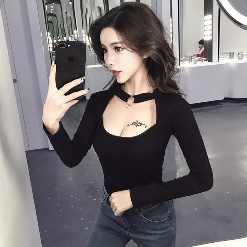Photo Shoot ~ Autumn Women's Scheming Sexy Neckline Hollow out Long Sleeve Base Shirt T-shirt Leaka